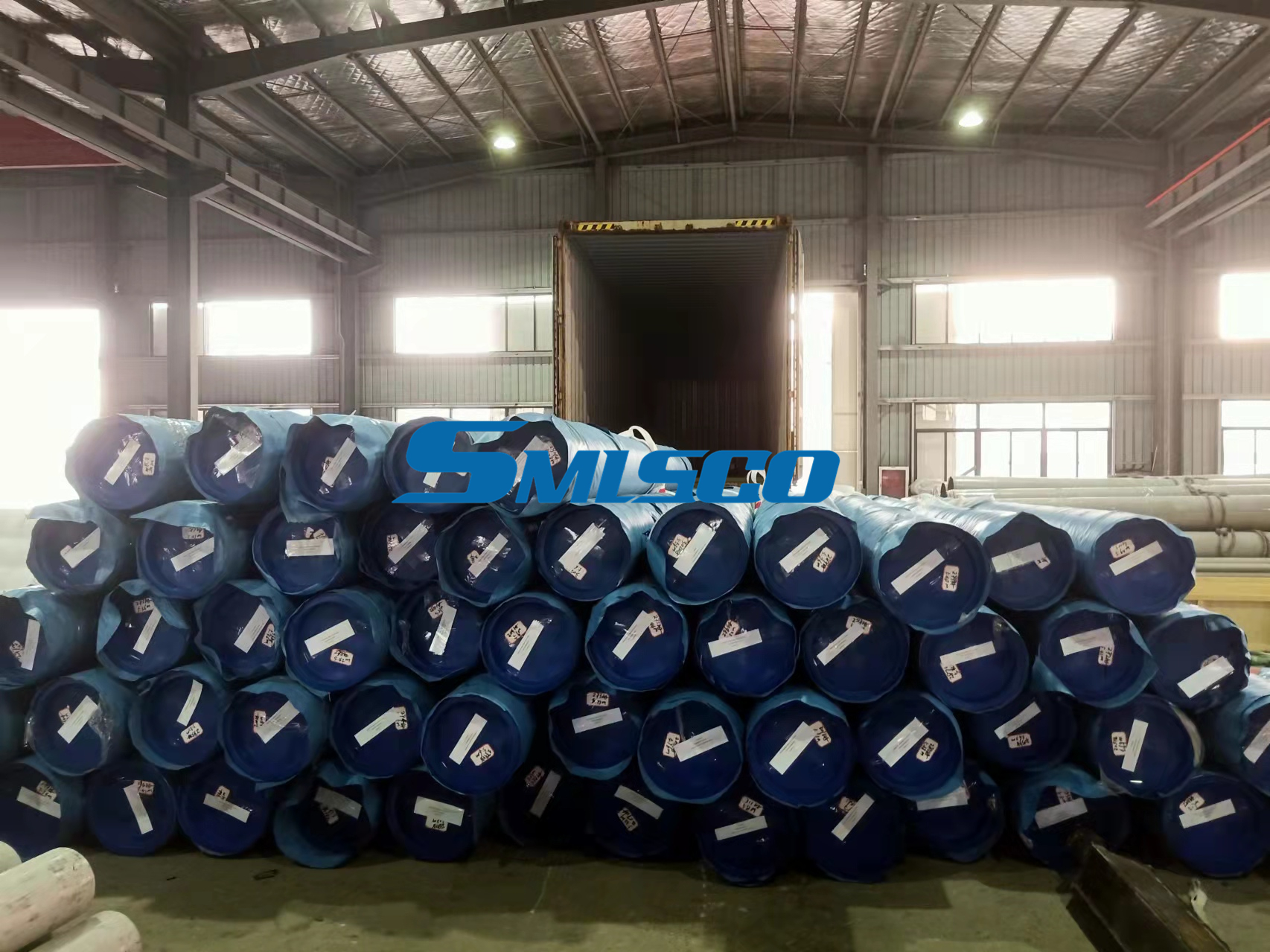 Smlsco, sitede bir forklift kamyonu hazırladı ve tüm takım malları yüklemek için hazırdı. 5-7.5m belirsiz boyut borusu olduğu için, boruları iki satırda 12m kabine yüklemek mümkündü, etkin bir şekilde uzayı tasarrufu sağladı ve aynı zamanda müşteriye daha fazla boru sunabiliyordu.